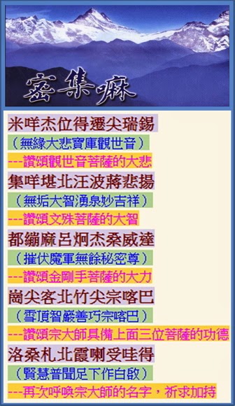 以上外、內、密及其他釋義全都是正確的,分別只是闡釋角度之不同。大家持咒時應想及以上所說之文義,心想大師與諸佛之身、語、意、悲、智、力等及觀音、文殊、金剛手乃至自己師長實為同一無異。我們最初觀想大師由彌勒的心所出,亦指大師與彌勒無二。事實上,大師與蓮華生大士及阿底峽大士都是同一心識在不同年代之化現,這一點有很多根據,如〈噶當寶藉〉中阿底峽祖師作懸記:『我曾伏魔往其地』及『又一化身往多康』,即說他就是蓮華生大士及多康出生之宗喀巴大師﹙註:多康為大師生地古名﹚,所以另外有一個禮讚大師的贊文內容說:『持明成就蓮華生,五百師首燃燈智,金剛持王善慧稱,頂禮大師各化身,這是稱蓮華生、阿底峽﹙燃燈智﹚及宗喀巴﹙善慧稱﹚是同一上師之不同化現。